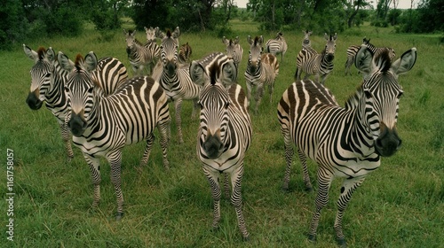 © PPS, Fototapeta premium A herd of zebras standing in a grassy field, looking directly at the camera.