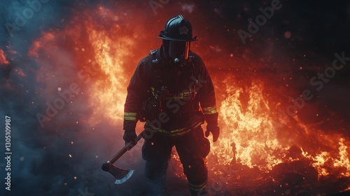 Fototapeta premium A heroic firefighter in full gear, standing against raging flames and thick smoke, with a fire axe in his hands