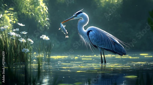 Fototapeta premium A heron catching a fish in crystal clear waters surrounded by reeds