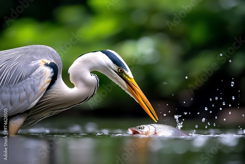 © Sanchai, Obraz premium A heron stalking its prey in a river, beak poised for the perfect strike as a fish swims nearby