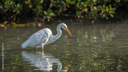 © Sona, Naklejka premium A heron standing in shallow water near green foliage.