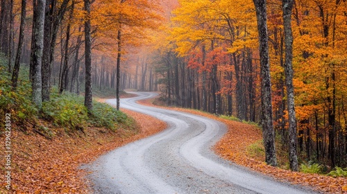 © Matcha_09, Fototapeta premium A hidden forest road with fog rolling in over the treetops, softening the background.