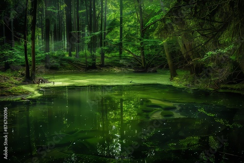 Fototapeta premium A hidden pond deep within a mystical forest, its emerald waters teeming with...