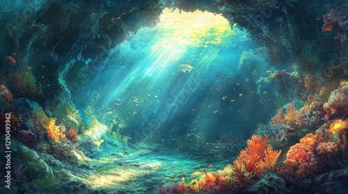 © linlies, Obraz premium A hidden underwater cave within a coral reef, illuminated by sunbeams filtering through the water.