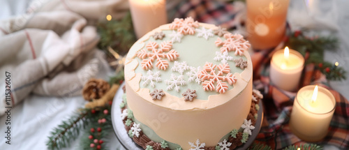 © khan, Fototapeta premium A high-angle photo of a bohemian round cake with a soft, pastel-colored Christmas hygge design on top.
