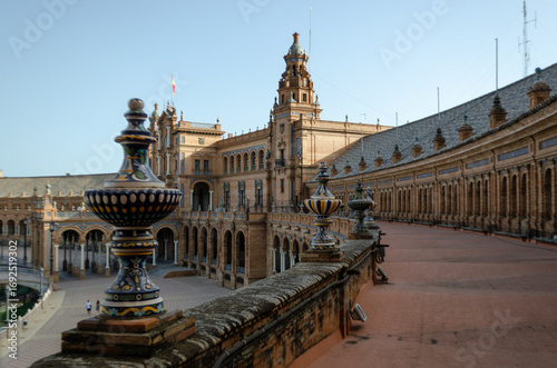 © Jonathan, Obraz premium A high-angle shot captures the stunning architecture of the Plaza de España in Seville, Spain. The focus is on the ornate ceramic balustrade in the foreground, leading the eye towards the building