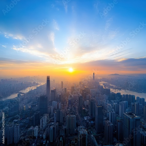 © Petchladda, Fototapeta premium A high-angle shot of a cityscape during sunrise.