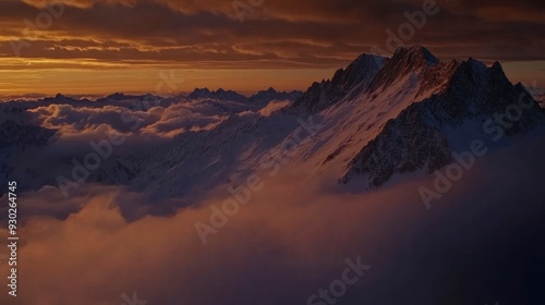 © Dzikrul Husnani, Naklejka premium A high-angle shot of snowy mountains covered with clouds during a dark evening , ai