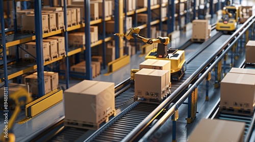 Naklejka premium A high-angle view of a sophisticated warehouse automation system with rows of cardboard boxes being moved by automated guided vehicles and conveyor belts with robotic arms sorting and stacking the