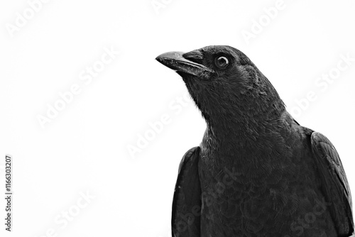 © Truman, Obraz premium A high-contrast black-and-white portrait of a crow, featuring intricate feather details and a minimalist white background. The composition highlights the bird's expressive gaze and elegant texture.