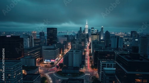 Fototapeta premium A high-contrast cityscape wallpaper featuring tall skyscrapers and bustling streets, modern, dramatic, downtown