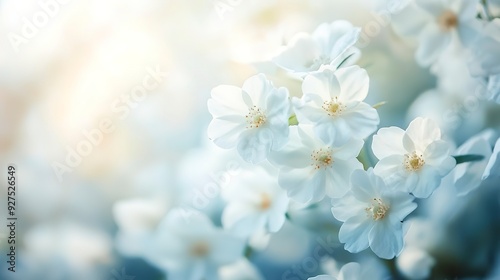© Thanthara, Obraz premium A high-definition, close-up image of pristine white flowers against a soft, defocused background, with sunlight filtering through, highlighting the flowers' delicate features