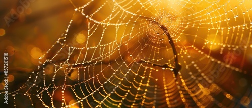 Naklejka premium A high-definition close-up of dewdrops on a spiderweb, glistening in the early morning light with intricate details of the web strands