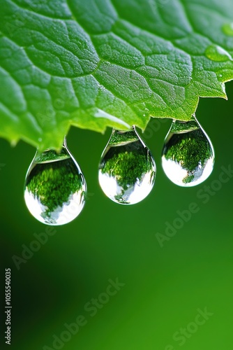 Fototapeta premium A high-definition macro photograph of crystal-clear water droplets delicately perched on the surface of a vibrant green leaf after a fresh rain.