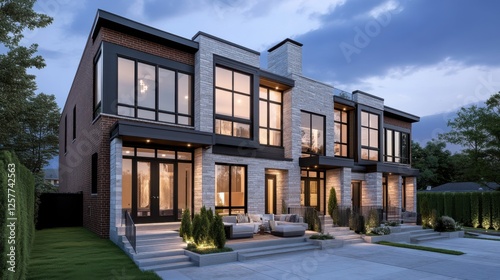 Naklejka premium A high-end townhouse with a rooftop terrace, modern brick and stone exterior,...