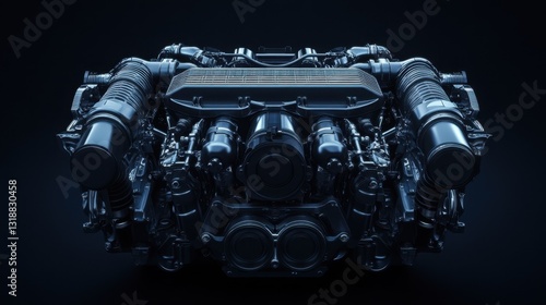 © Artittaya, Fototapeta premium A high-performance turbocharged engine on a deep black background with soft reflections.