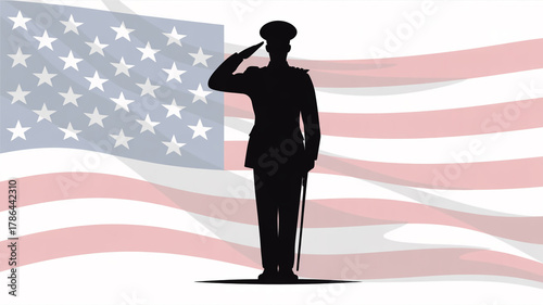 © Nusrat, Obraz premium A high-quality black silhouette of a proud military officer standing at attention and saluting in front of a softly waving national flag backdrop.