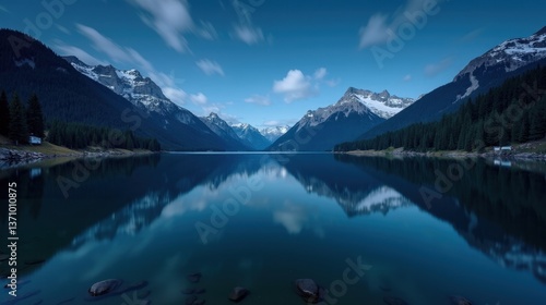 © Collse, Naklejka premium A high-quality professional photo of Lake Sils in Switzerland during night with sunny conditions, shot from an ordinary perspective