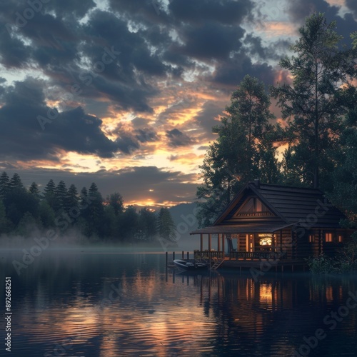 Fototapeta premium A high-quality stock image of a serene lakeside cabin at dusk. The scene is...