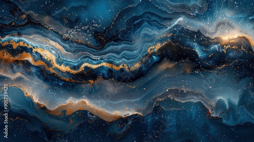 Fototapeta premium A high-resolution abstract image showcasing a textured blue background with gold and liquid paint effects, creating a seamless pattern that reflects the elegance of mineral and rainbow textures