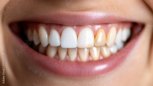 © Pinklife, Fototapeta premium A high-resolution close-up image showing a person's smile with one prominently discolored tooth among otherwise bright white and well-maintained teeth, indicating dental health issues.