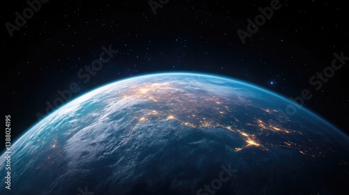 Obraz premium A high-resolution image depicts Earth from space, showcasing city lights and cloud formations. The composition focuses on the planets curve against a dark, starry backdrop. The image is digitally ren