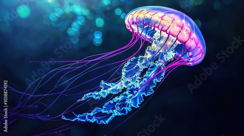 Fototapeta premium A high-resolution image of a close-up jellyfish against a vibrant blue and purple backdrop, featuring soft focus ambient light