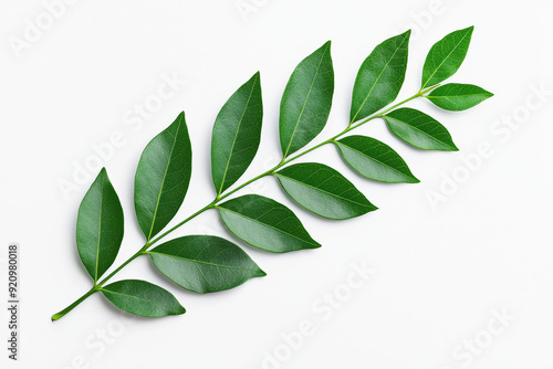 Naklejka premium A high-resolution image of a fresh green branch with glossy leaves, isolated on a white background, perfect for nature or botanical themes.
