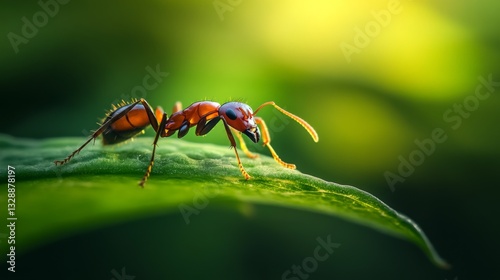 Naklejka premium A high-resolution image of a single ant on a green leaf, showcasing its fine...