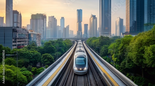 © Illustratorstock, Fototapeta premium A high-speed electric train traveling through a metropolitan cityscape, gliding silently along an elevated railway track.