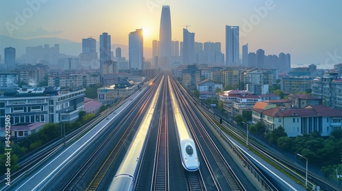 © visoot, Fototapeta premium A high-speed rail passing across city. against a blue sky. Aerial high view. Generative AI.