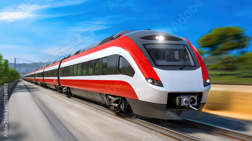 Naklejka premium A high-speed red and white train traveling on a sunny day, showcasing modern...
