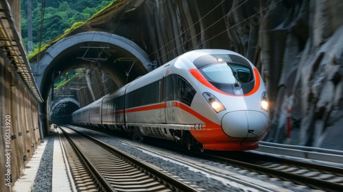 Fototapeta premium A high-speed train emerging from a tunnel with a burst of speed, symbolizing...