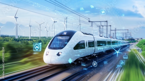 © MEHDI, Naklejka premium A high speed train moving through the countryside, with wind turbines in the background, surrounded by digital data streams and green energy icons