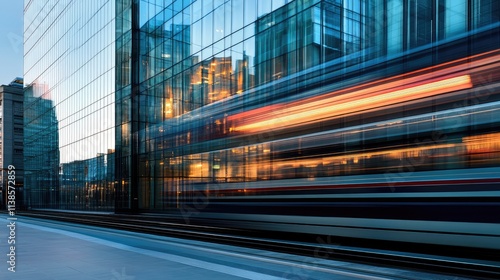 © Timeless Touch, Fototapeta premium A high-speed train speeding past a large glass building, with its reflection captured on the building's shiny windows