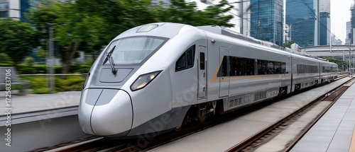 Naklejka premium A high-speed train stands ready at a busy city station, surrounded by tall...