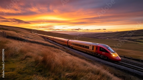 Fototapeta premium A high-speed train streaking through a rural landscape under dramatic sunset...
