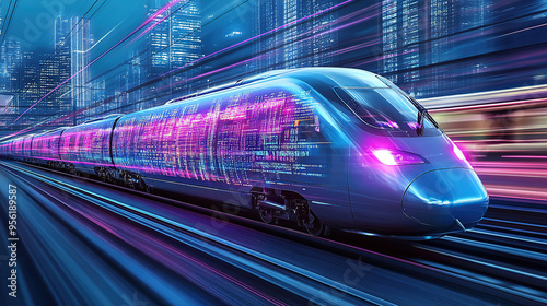 Naklejka premium A high-speed train with digital data flowing through it, a futuristic...