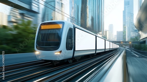 Naklejka premium A high-speed train zooms through a city, with blank billboard spaces on its...