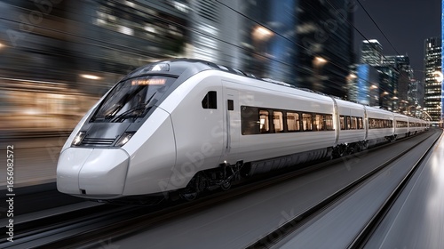 Naklejka premium A high-speed train zoos by, featuring a sleek white and blue design with vibrant lights illuminating the busy urban area at night