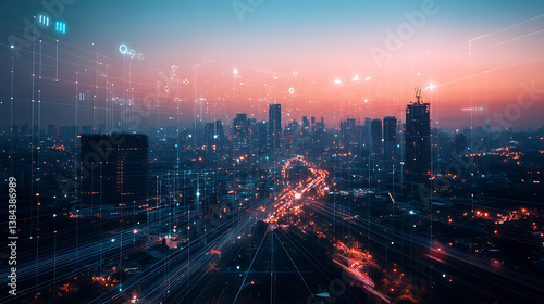 Naklejka premium A high tech AI controlled environmental monitoring system tracking air quality and pollution levels in real time across urban areas, Environmental monitoring style, photo of