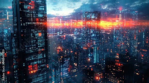 Fototapeta premium A high-tech AI-driven cityscape constantly reconfiguring with holographic...