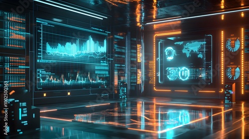 Obraz premium A high-tech business environment with transparent screens displaying a...