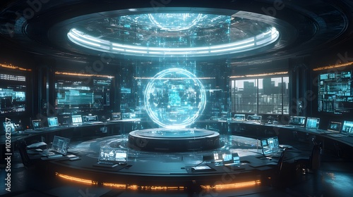 Obraz premium A high-tech circular lab with glass walls, interactive workstations...
