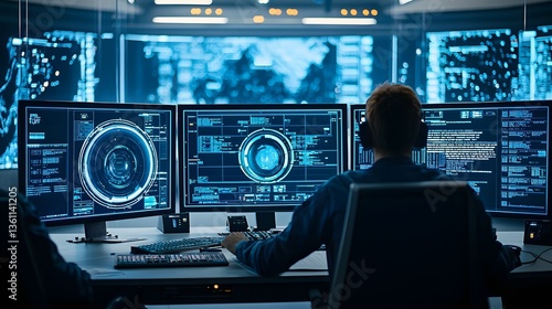 Obraz premium A high tech control room with multiple screens and advanced data...