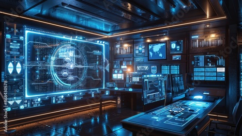 Fototapeta premium A high-tech cyber defense center with holographic displays and data streams, digital art, emphasizing protection and innovation.