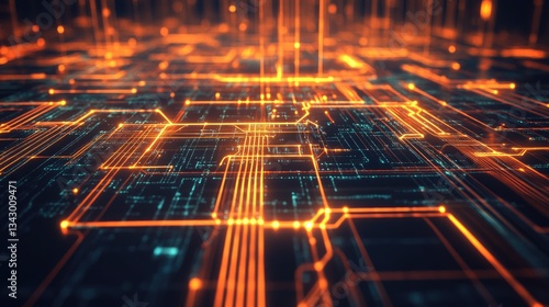© Sampao, Fototapeta premium A high-tech digital business logo with an abstract PC icon and glowing network lines.
