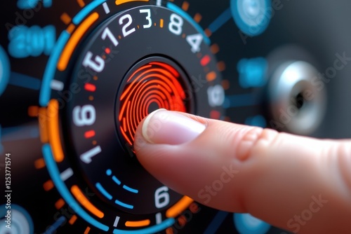 Fototapeta premium A high-tech digital fingerprint scanning concept featuring a futuristic interface with biometric authentication. The glowing fingerprint is highlighted against a sleek, technology-inspired background
