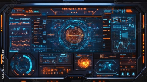 © Sirinya, Obraz premium A high-tech digital interface with glowing blue and orange data streams, showcasing futuristic analysis and interaction elements.