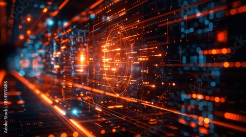Obraz premium A high-tech digital interface with vibrant orange and blue lights,...